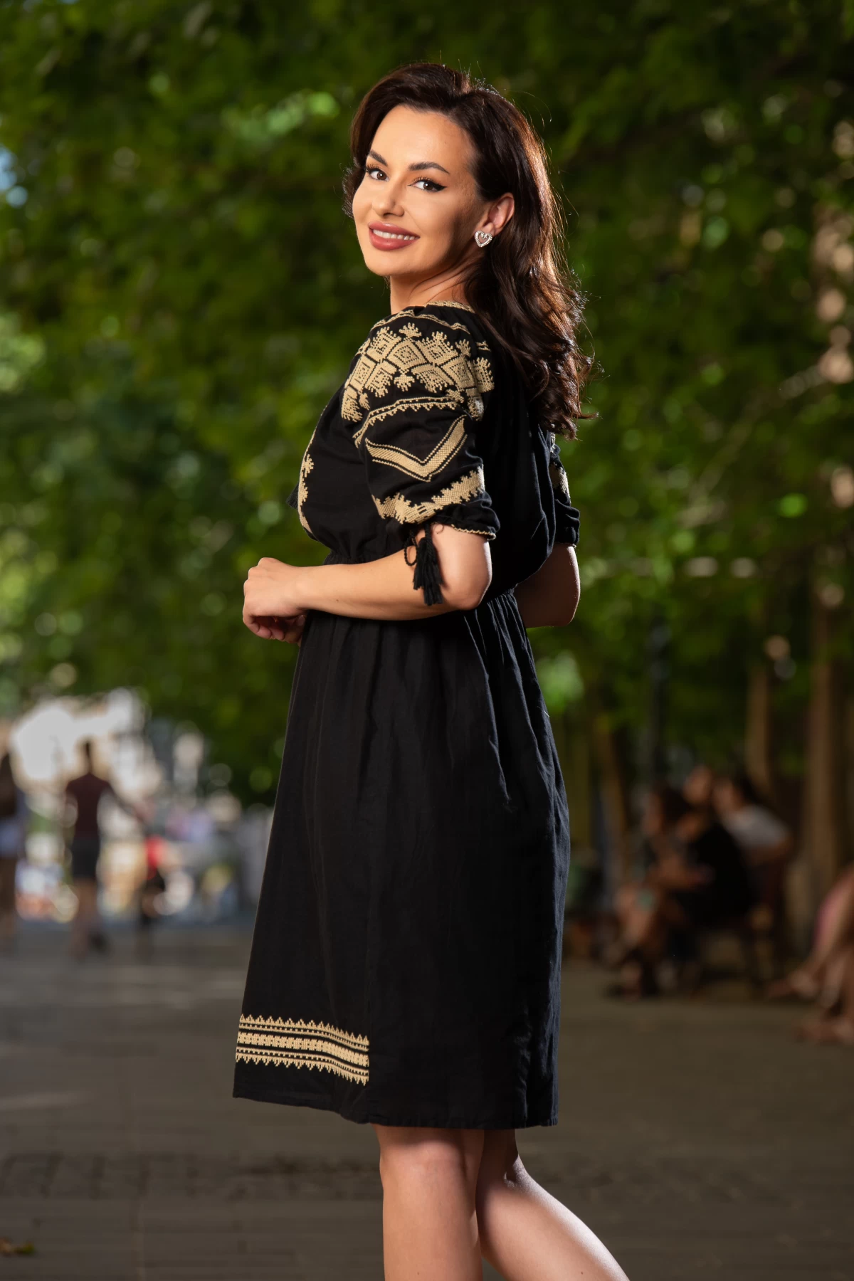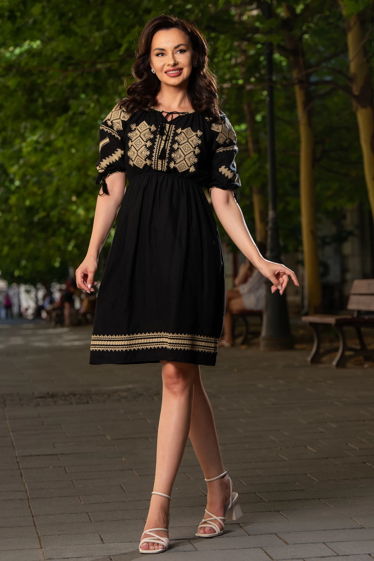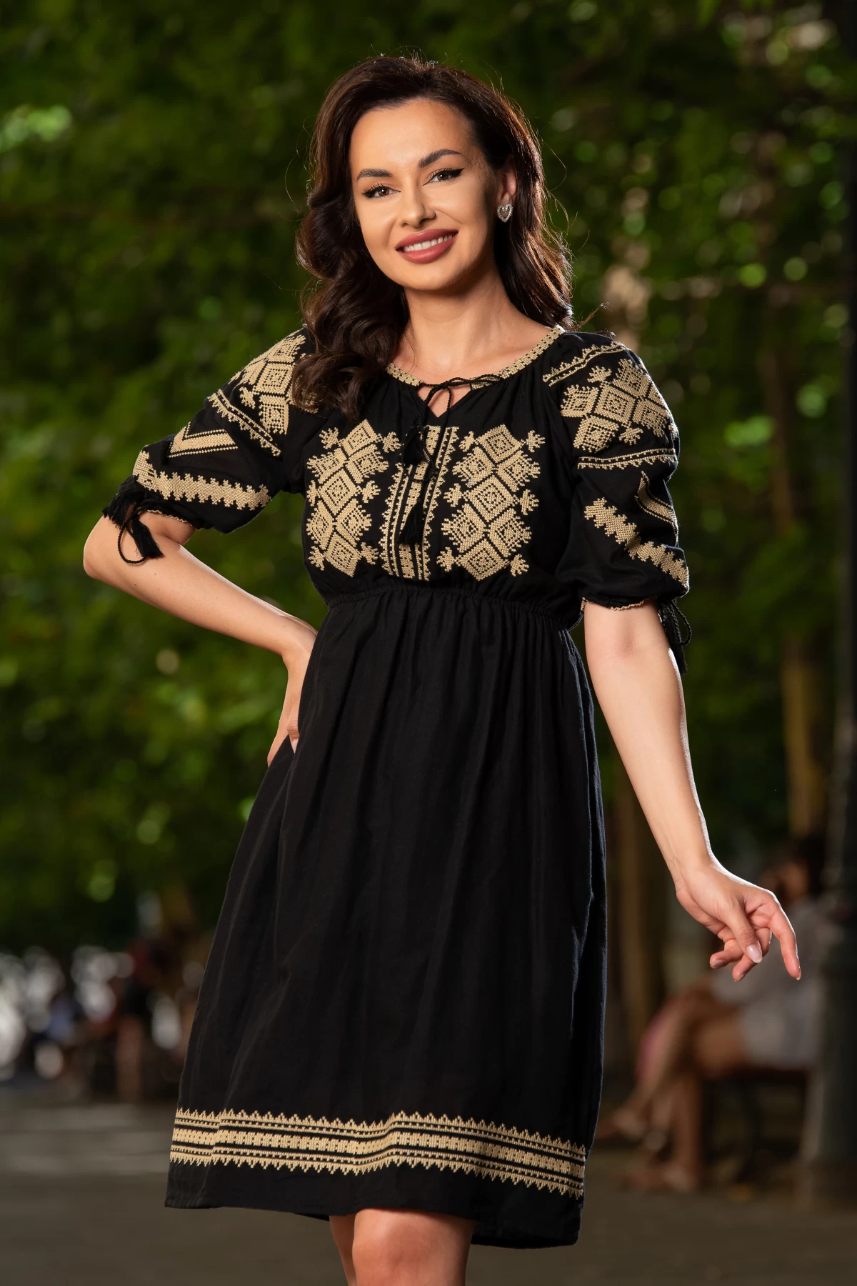 Rochie traditionala neagra in clos Dana cu motive romanesti brodate ; Culoare: negru ; Croi: clos ; Elastic in talie ; Decolteu rotund ; Snur negru cu ciucuri la baza gatului ; Maneca scurta ; Broderie traditionala cu motivul rombului ; Fara sistem de inchidere ; Prezinta dublura ; Compozitie: 100% bumbac ; * Echipa noastra face toate eforturile in a prezenta cat mai bine culorile produselor prezentate pe site insa culorile pot diferi de situatia reala si pot varia în functie de setarile monitorului/dispozitivului dvs!