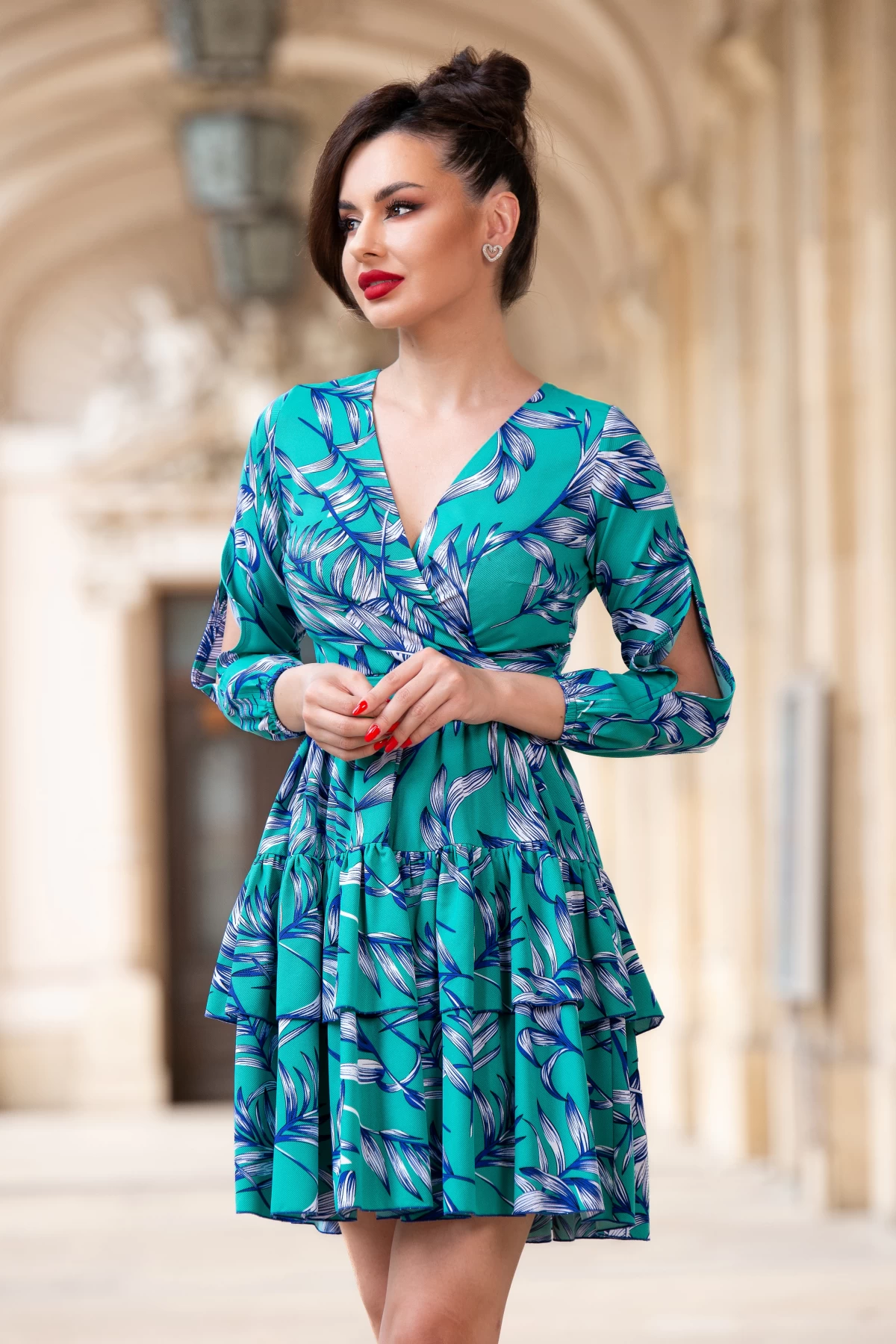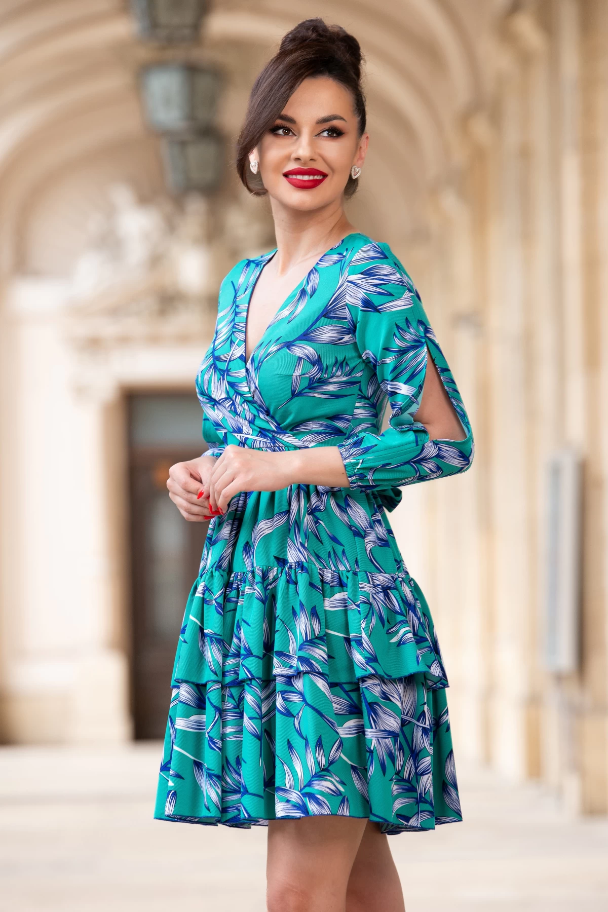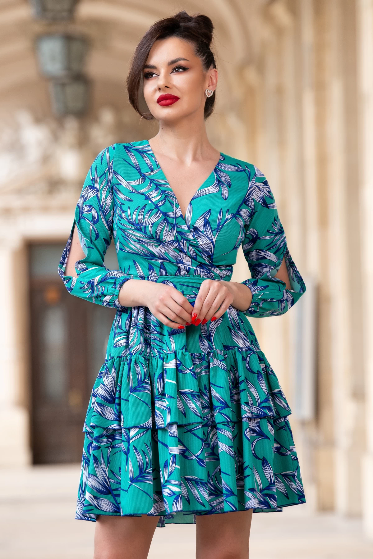 Rochie verde cu volanase si imprimeu floral By InPuff ; Culoare: verde ; Croi: clos ; Prezinta dublura ; Decolteu in V petrecut ; Material plinut texturat ; Maneci trei sferturi cu elastic la terminatie ; Decupaj adanc pe maneca ; Inchidere cu fermoar la spate ; Cordon detasabil in talie ; Fabricat in Romania ; * Echipa InPuff face toate eforturile in a prezenta cat mai bine culorile produselor prezentate pe site insa culorile pot diferi de situatia reala si pot varia în functie de setarile monitorului/dispozitivului dvs! p>