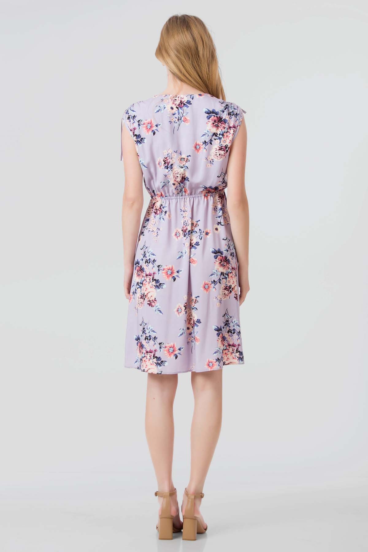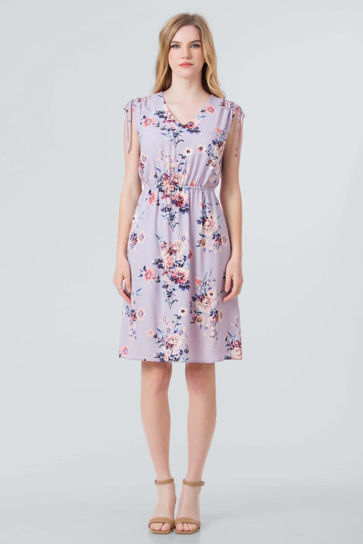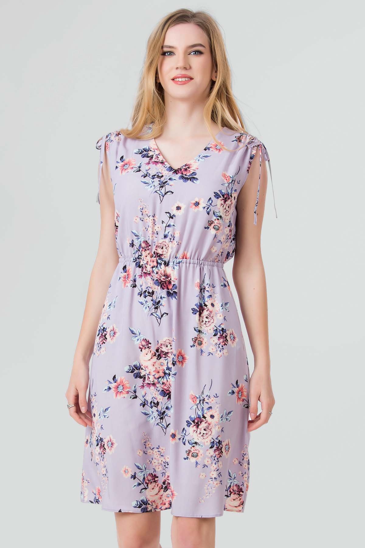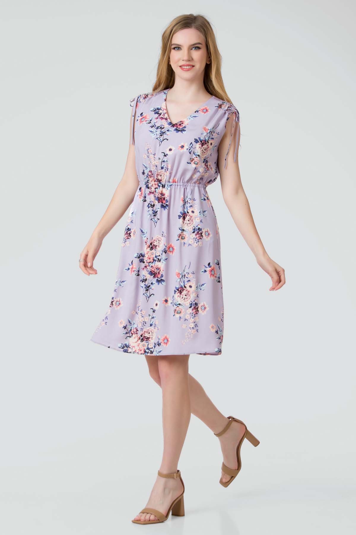 Rochie April din viscoza imprimata, croi cu buzunare laterale, talie reglabila cu elastic si incretire la umeri cu snur.