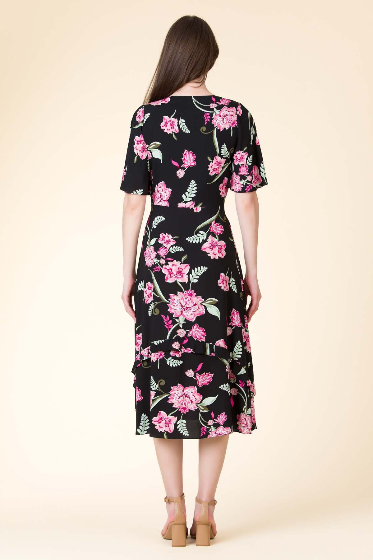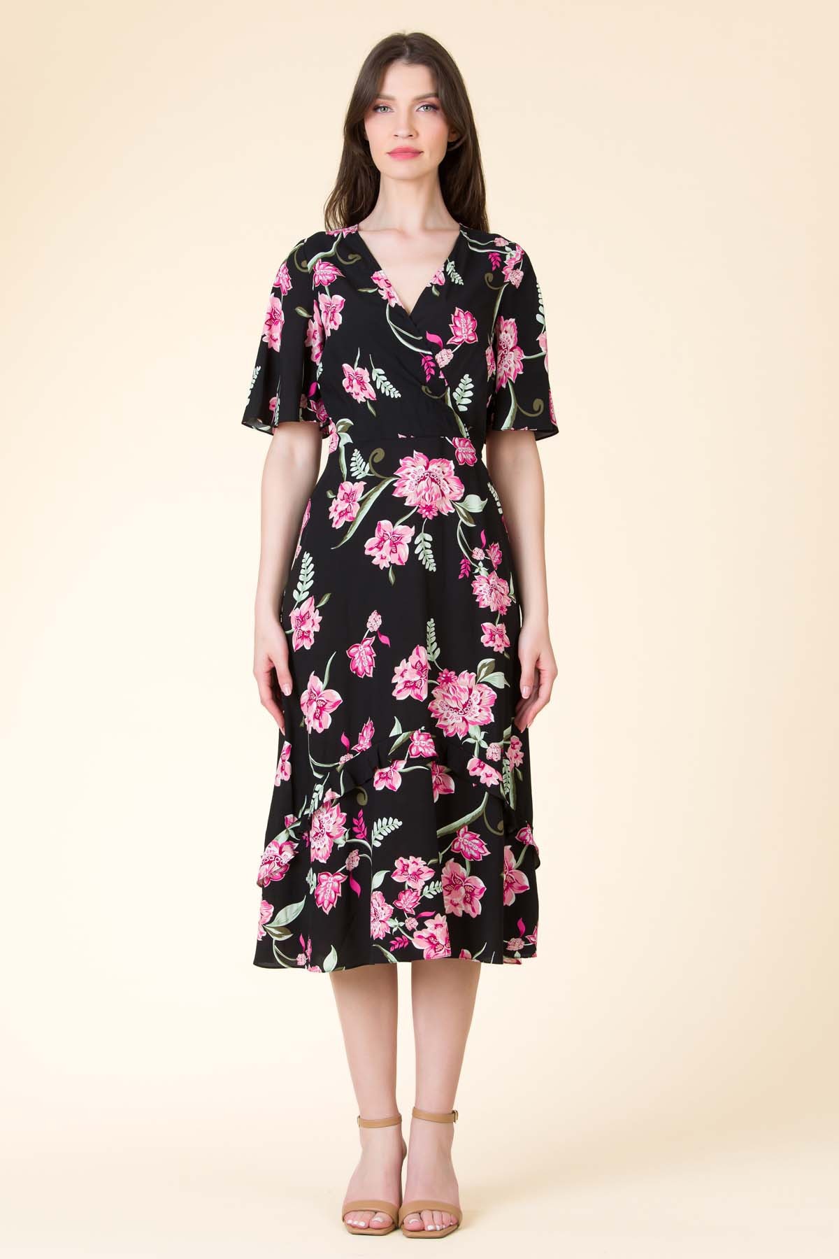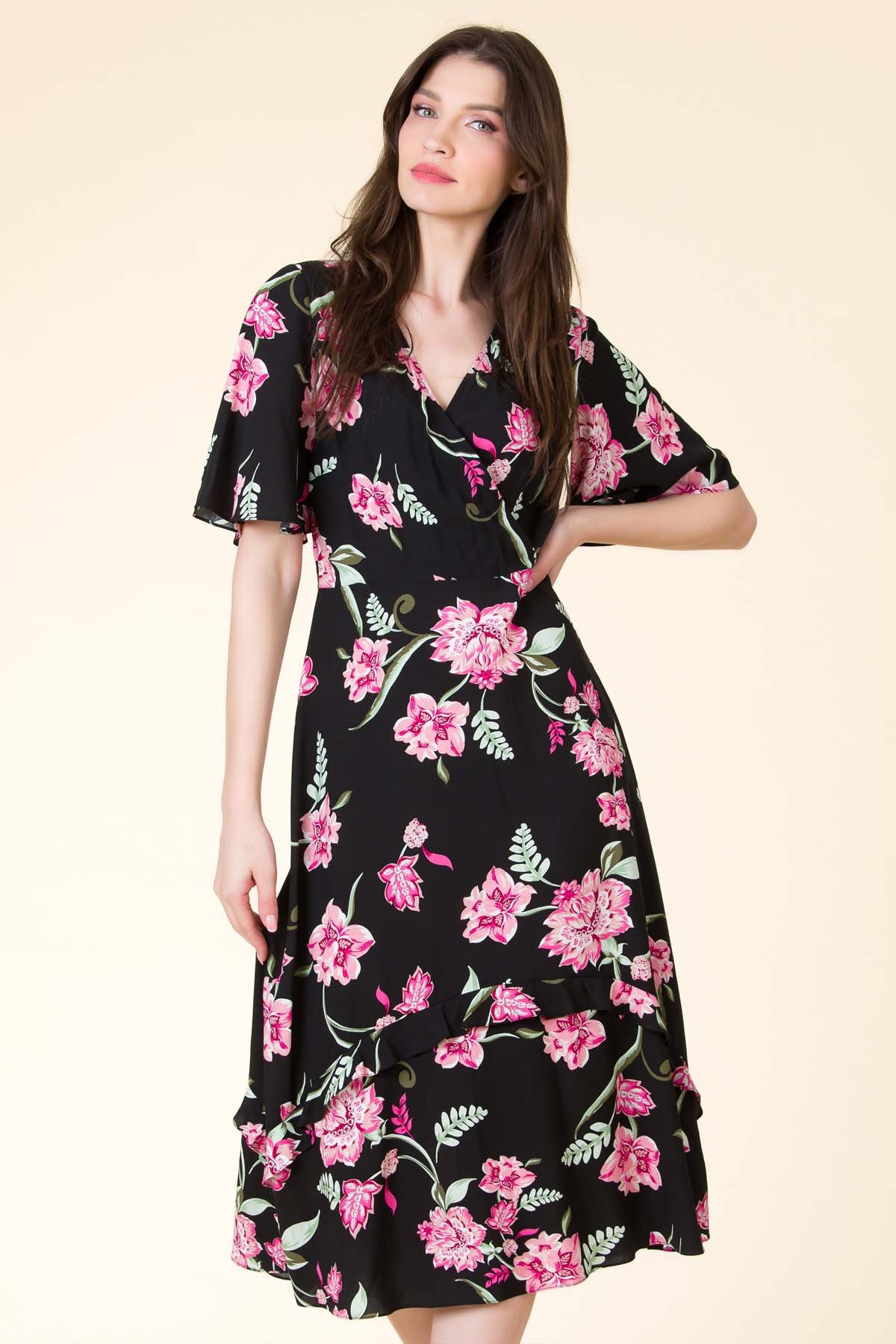 Rochie Celinne din viscoza imprimata, croi feminin cu maneca evazata si volan pe partea de fusta.