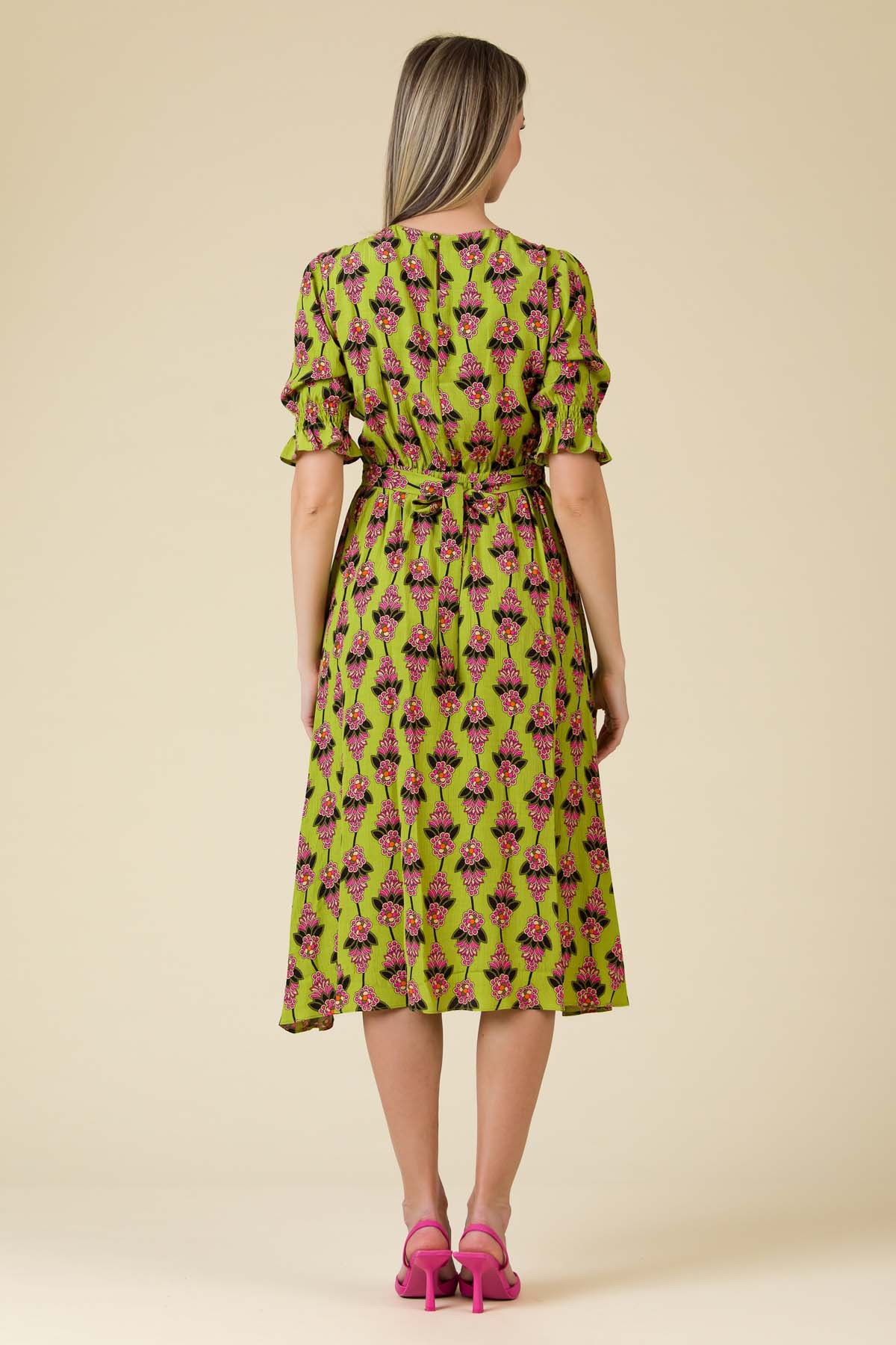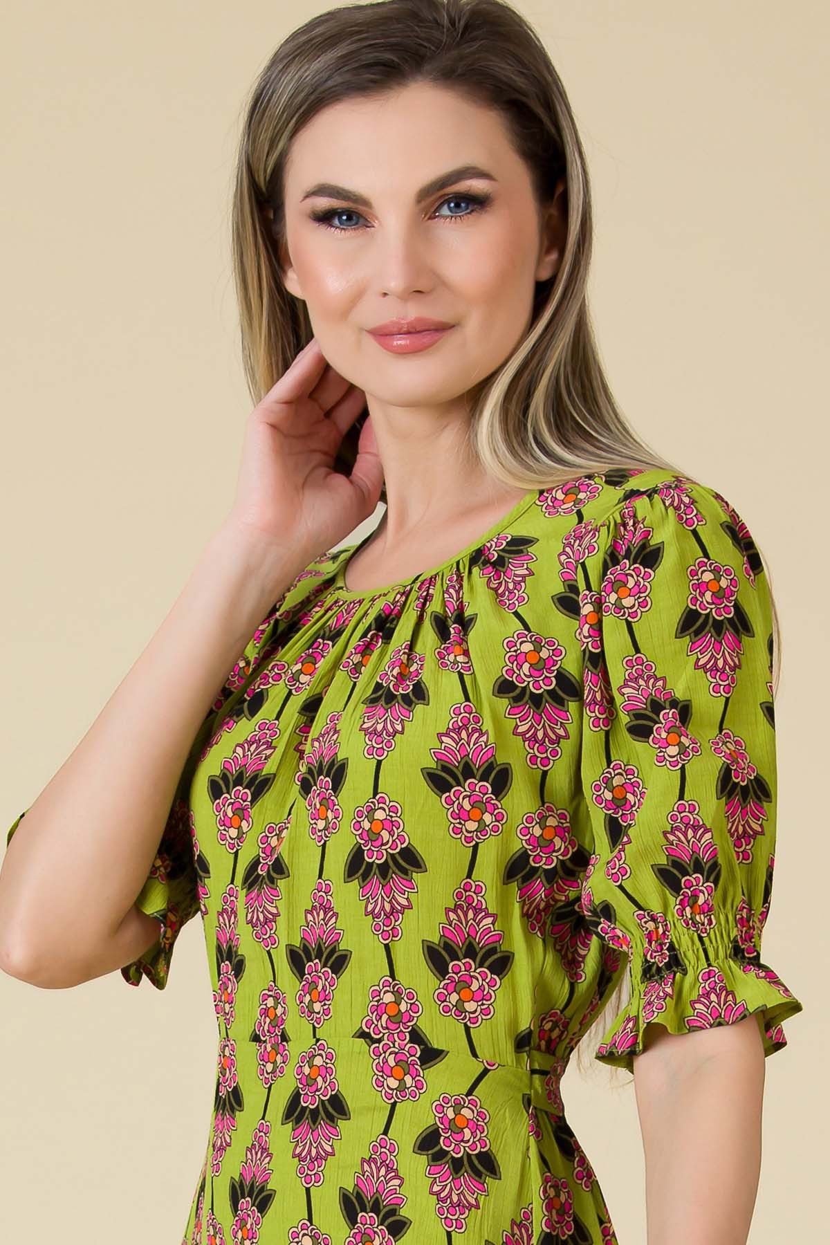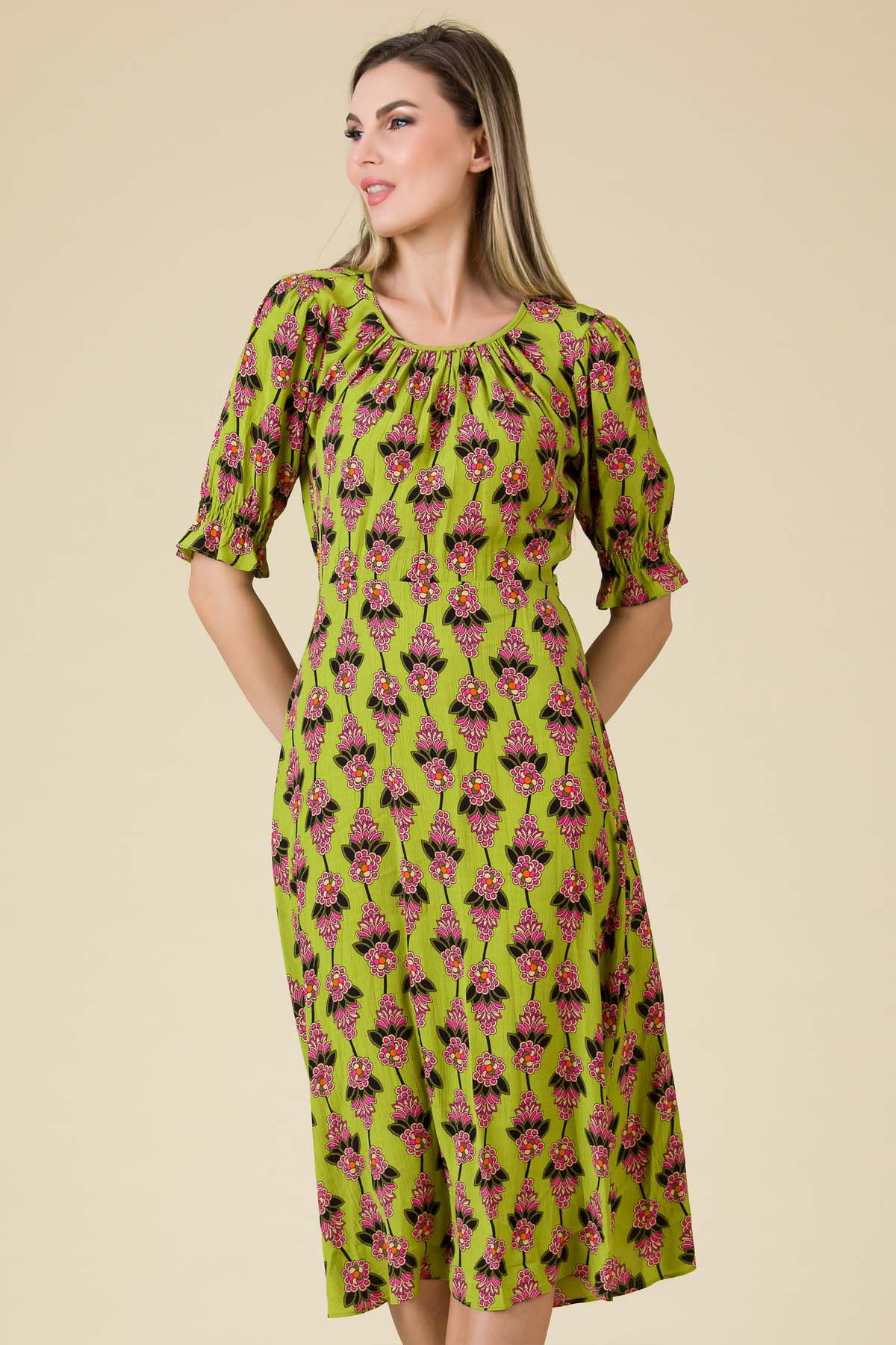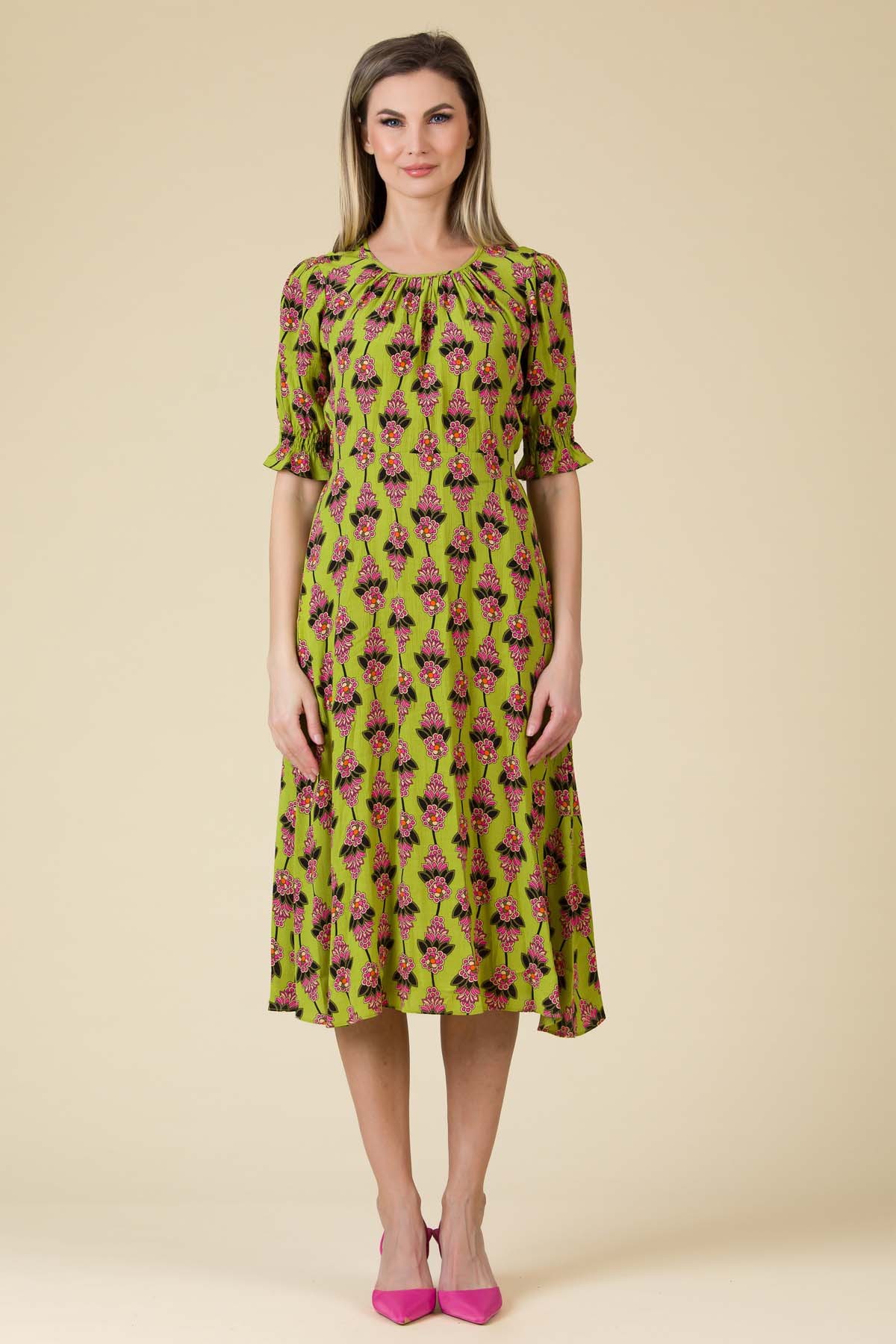Rochie Ilona din viscoza imprimata, croi feminin cu fusta ampla si maneci cu elastice multiple.