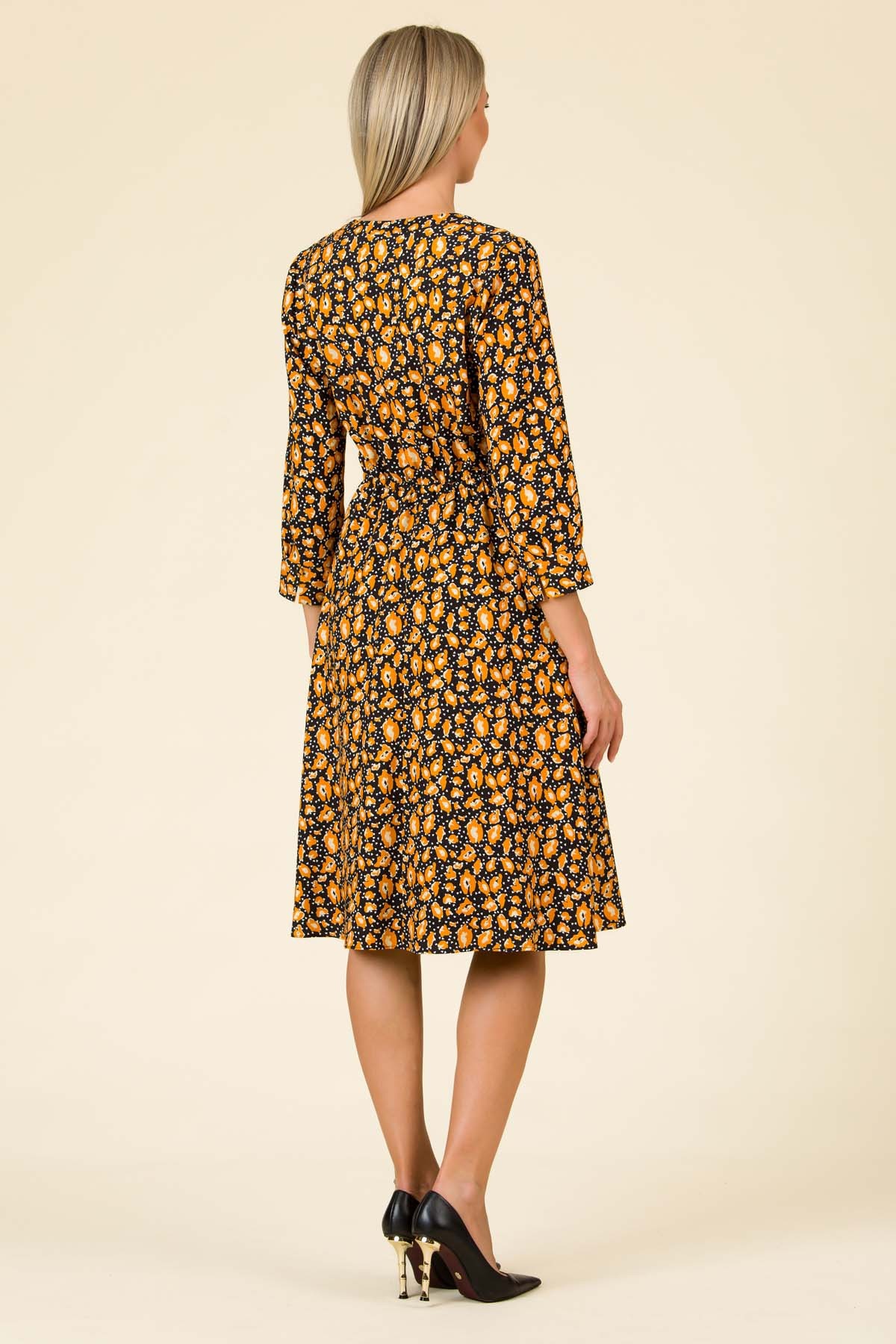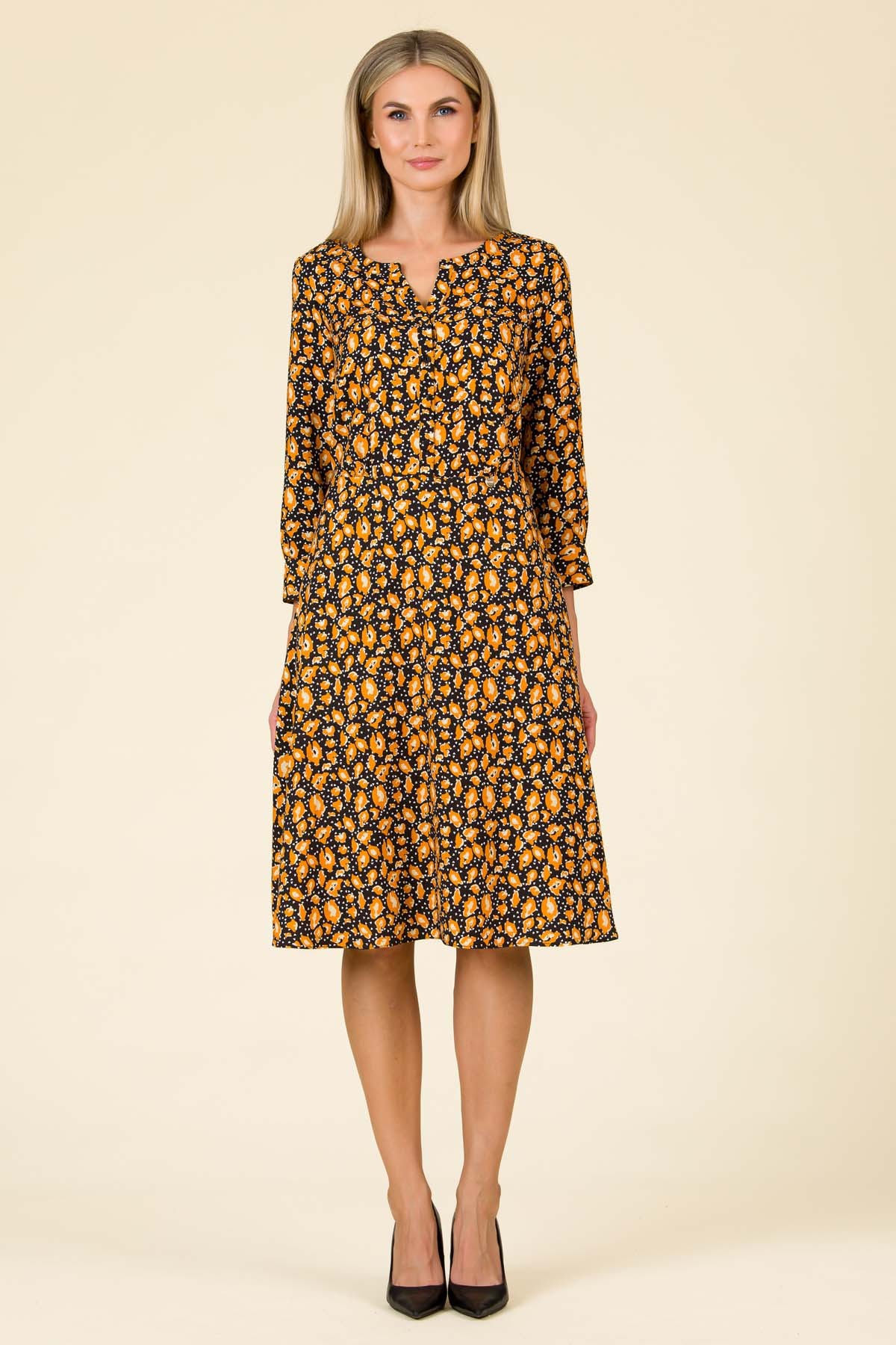 Rochie Ivette din viscoza imprimata, croi feminin cu maneci cu volum si mansete late, incretire la spate si nasturi imbracati in decolteu.