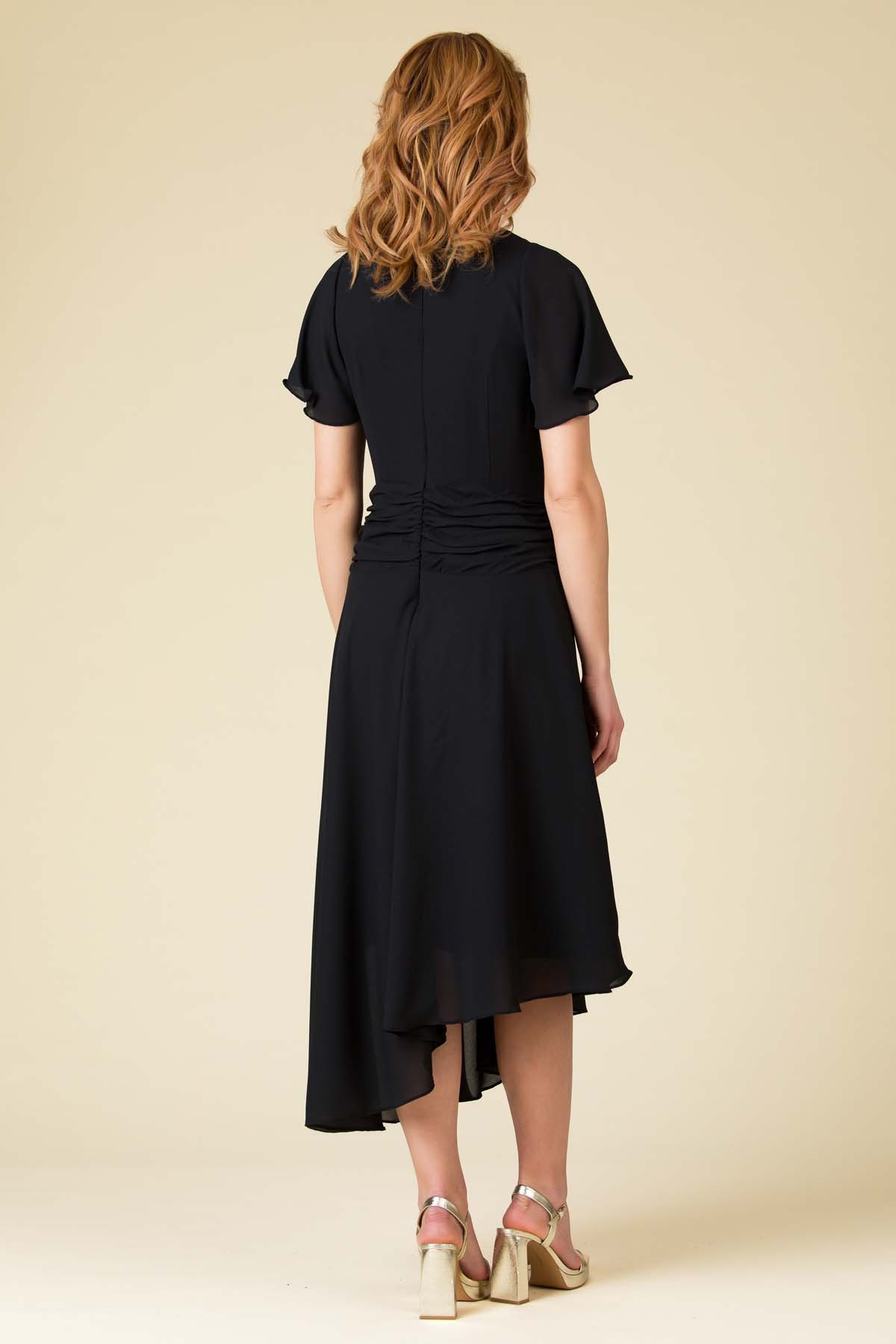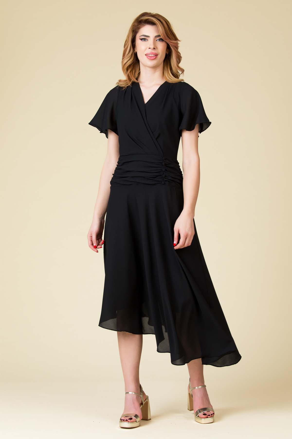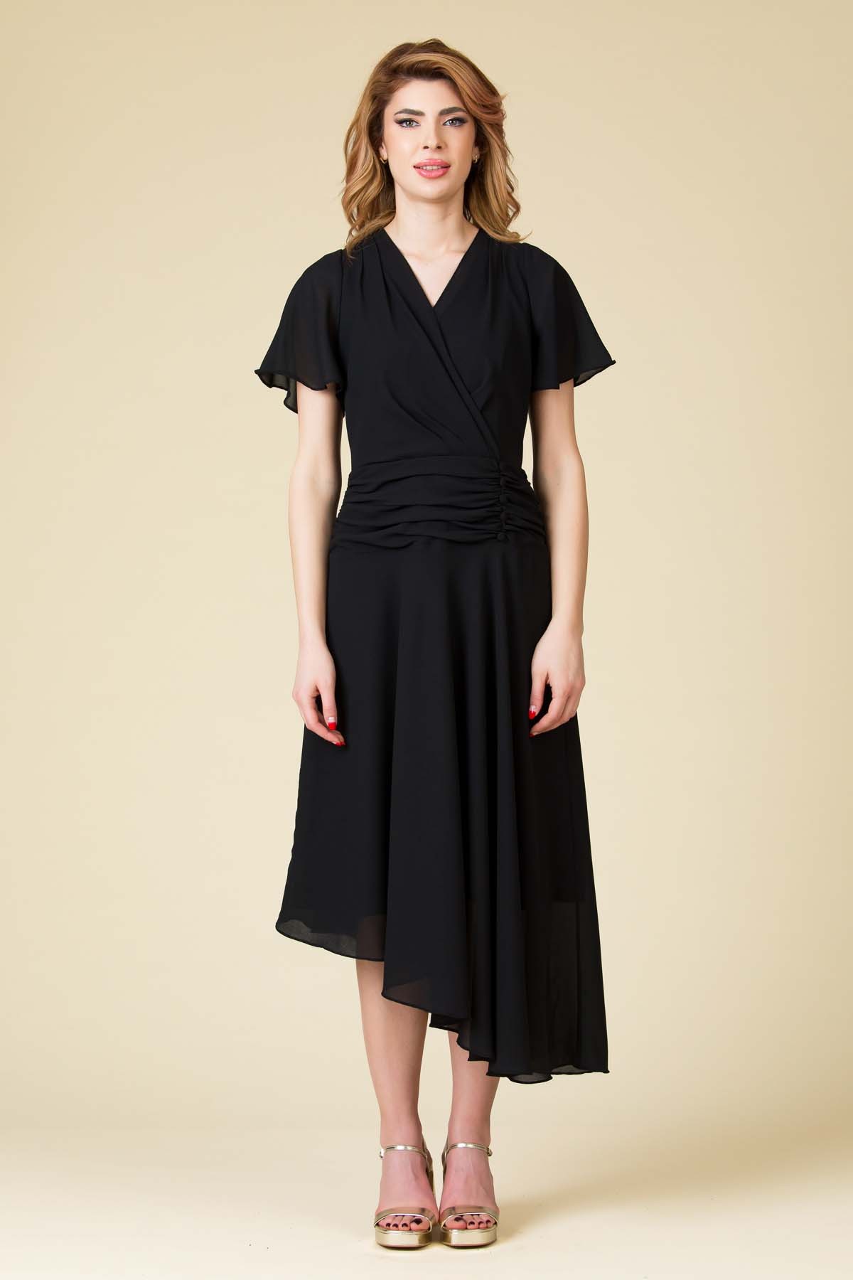 Rochie voal Nadya, croi asimetric cu falduri si nasturi decorativi in talie si maneca clopot.