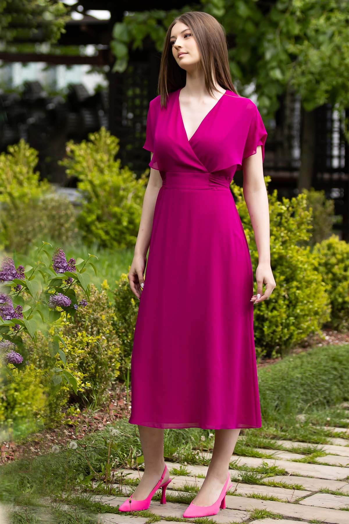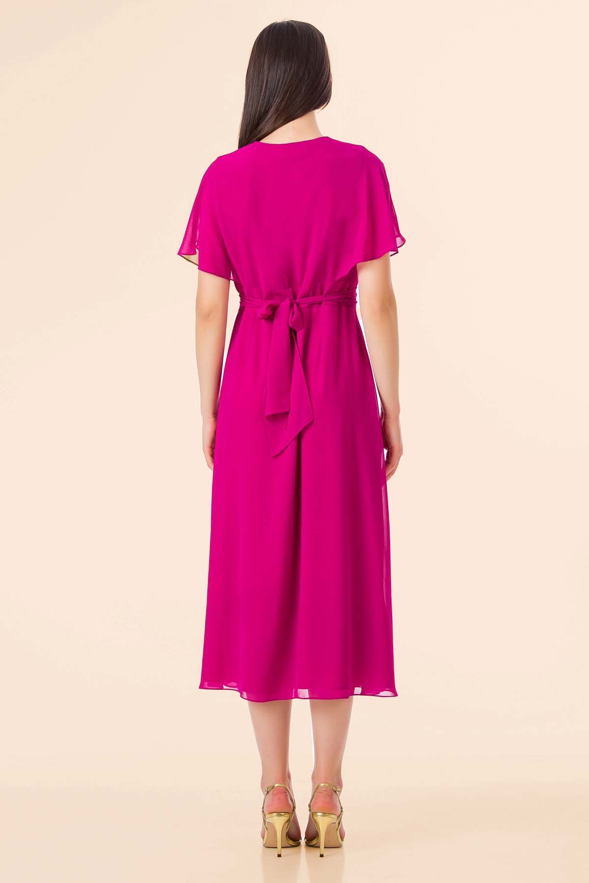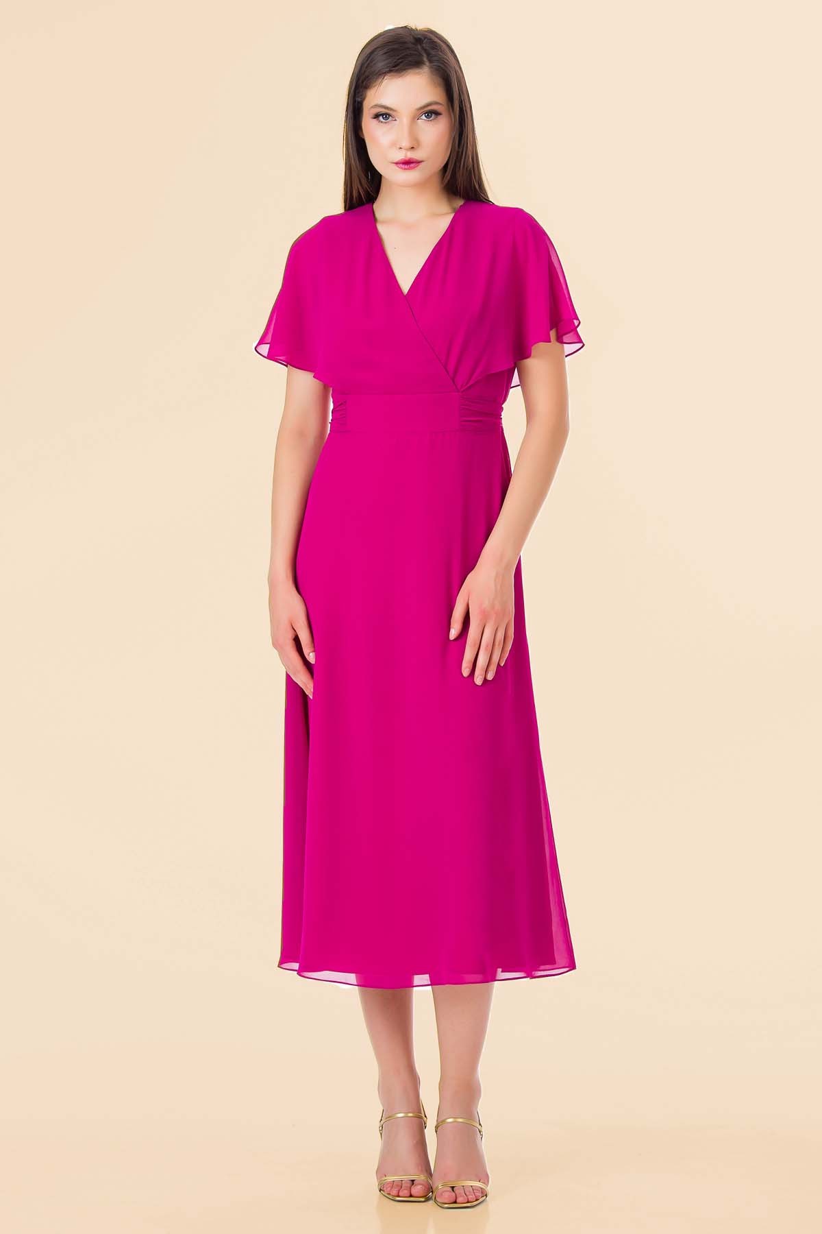 Rochie Rebecca din voal, croi feminin cu talie marcata de cordon ce se leaga la spate, maneci tip pelerina si decolteu in V.