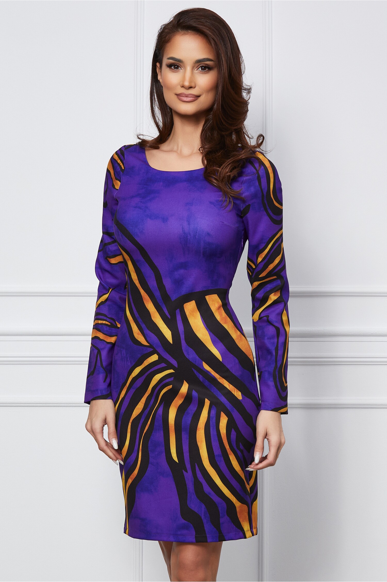 Rochie de zi cu imprimeuri. Are decolteu rotund, maneci lungi si croi conic. Rochie de zi Decolteu rotund Maneci lungi Croi conic Captusita la bust Se inchide cu fermoar la spate Material: Stofa Compozitie: 95% Poliester, 5% Elastan Instructiuni de intretinere: *Va rugam verificati eticheta produsului inainte de curatare! *Pozitia tiparului imprimeului poate fi diferita datorita taierii. *Modelul are inaltimea de 174 cm. *Va rugam sa retineti ca o usoara discrepanta de culoare ar trebui sa fie acceptabila datorita luminii si luminozitatii ecranului. *Va rugam verificati ghidul de marimi, in cm, pentru a alege corect marimea.