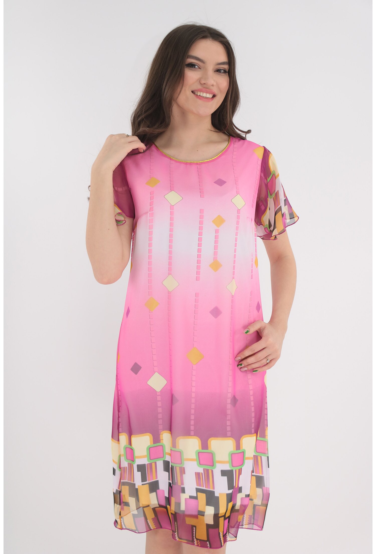 -Rochie din voal roz cu imprimeu geometric -Captusita -Croiala lejera -Decolteu rotund -Maneci scurte evazate -Inchidere la spate cu panglica din organza -Fabricat in Romania MATERIAL: 40% Vascoza, 60% Poliester Captuseala: 100% Poliester LUNGIME: 104 cm la marimea 42, lungimea produsului creste cu 1 cm la fiecare marime