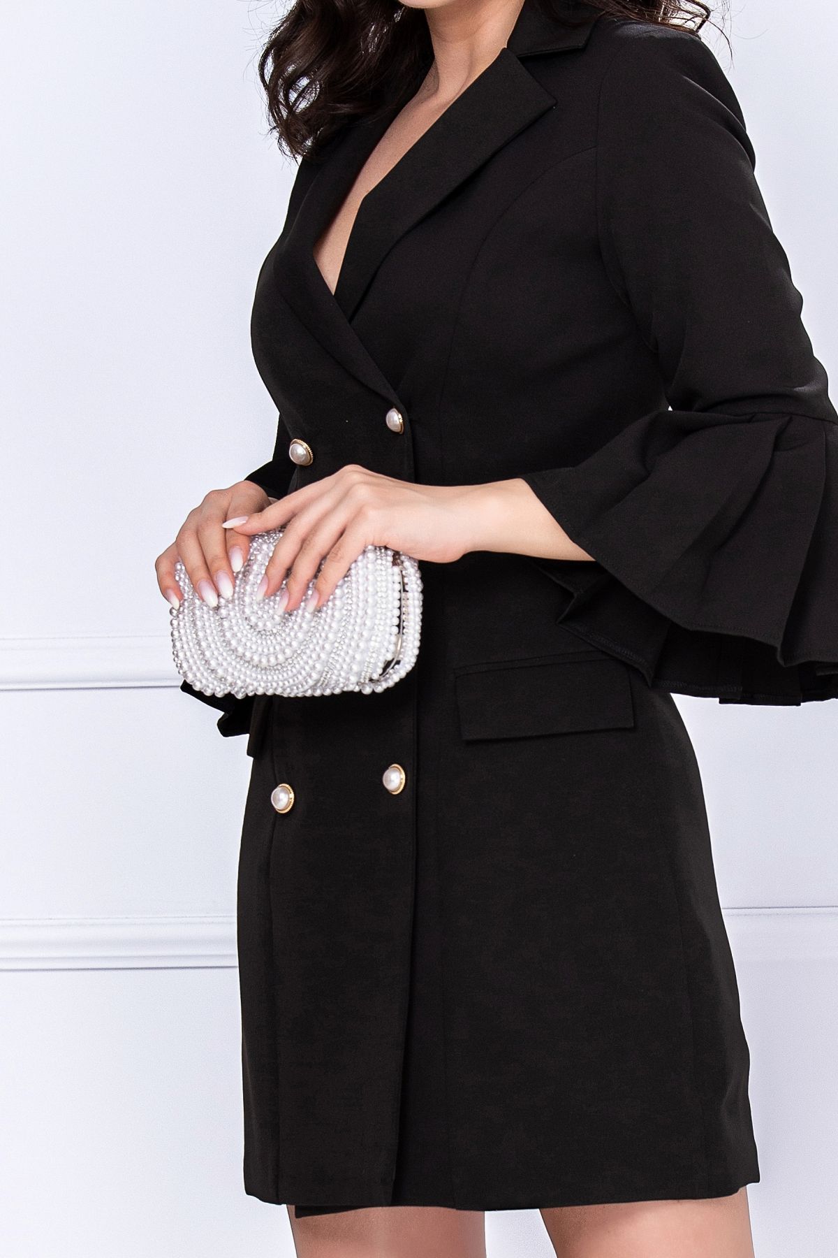 Rochie tip sacou eleganta neagra cu pliuri la maneca ; Culoare: negru ; Textura: stofa ; Maneci trei sferturi cu pliuri la terminatie ; Decolteu in V petrecut ; Prezinta revere ; Clapete de buzunar decorative ; Dublata pe interior ; Inchidere cu sase nasturi aurii cu perla ; Compozitie: 50% poliester 50% elastan ; Fabricat in Romania ; * Echipa noastra face toate eforturile in a prezenta cat mai bine culorile produselor prezentate pe site insa culorile pot diferi de situatia reala si pot varia în functie de setarile monitorului/dispozitivului dvs!